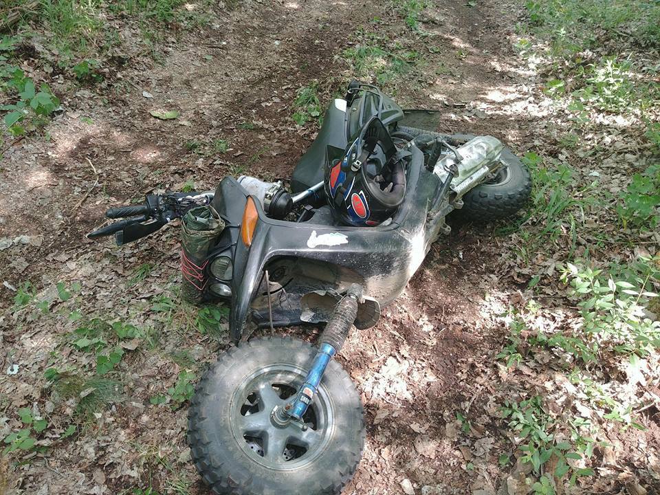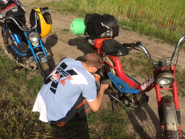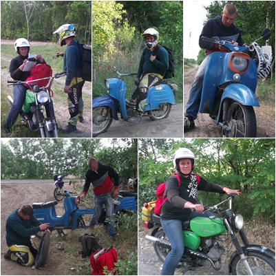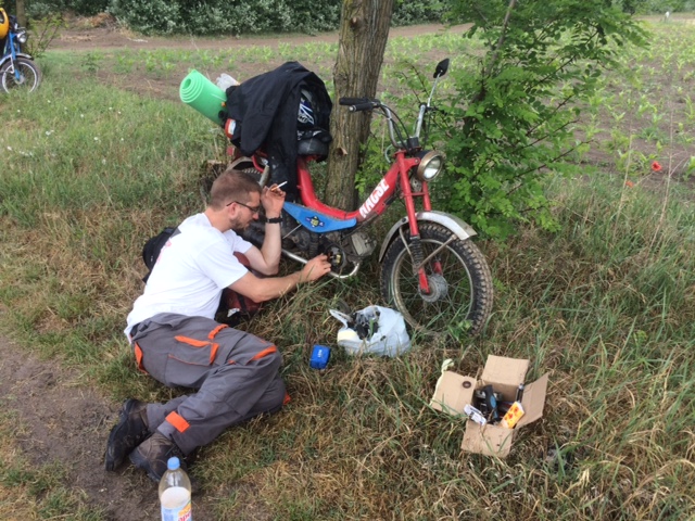 Indulás jól haladtunk, egészen, odáig míg utolértünk két motorost, akik előttünk töketlenkedtek én úgy gondoltam gyorsabb vagyok náluk 1-2 km/h-val és előzök mi nem jól sikerült egy hatalmasat bukfenceztem, lámpa betört eleje elgörbült tank behorpadt. Térdem nagyon fájt a lábam szára is az állam vérzett. De jól vagyok, gyerünk tovább! Onnantól nagyon féltem és vége volt a sietésnek, alig haladtunk mindenhol megálltam gödör kanyar homok stb.