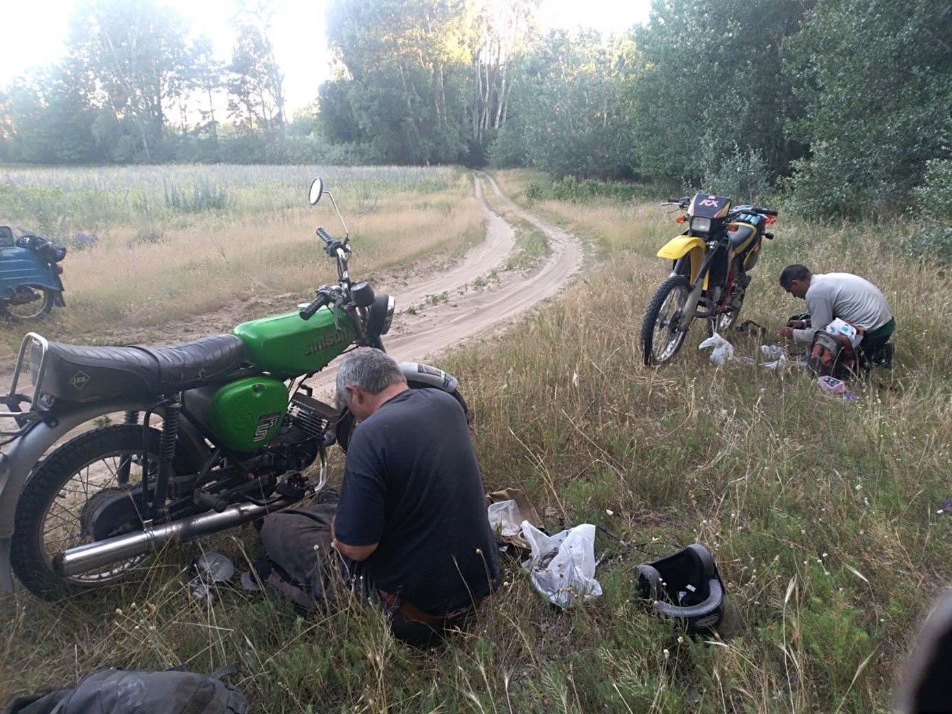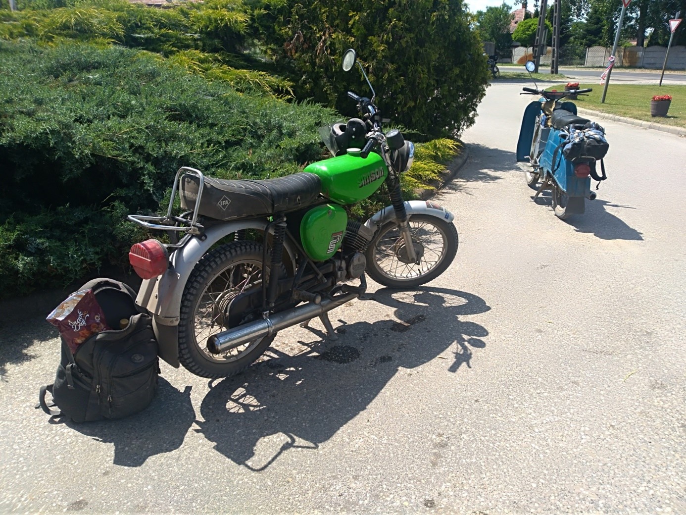 A rallyn a jó felkészülés ellenére is több, főleg műszaki hiba adódott. Kezdtük azzal, hogy az Aprilia karburátor eldugult, azt kellett kitisztítani. Éppen egy benzinkúti pihenő alkalmával vettük észre, hogy az én motorom defektes. Egy másik benzinkúti tankolás alkalmával a nagy sietségben a fiam Simsonja kapott 7 dl (10%) gázolajat. Ez után mondogatta, hogy nem úgy megy, ahogy szokott, sőt egyre rosszabbul, pedig az újabb kiskunhalasi benzin tankolás hatására javulnia kellett volna. Karburátor rendben volt, így felkészültem, hogy a rossz, egyébként elektronikus gyújtását lecserélem az alkatrészkészletből megszakítós gyújtásra. A lendkerék és az alaplap kiszerelés után derült fény a hibára, a főtengely szimering esett ki a helyéről. Azt visszaütve a motor jól működött. Közben az Arilián is cseréltünk gázbowdent. A vége felé már az elszántsággal is voltak gondjaink, de egymást biztatva túljutottunk a holtpontokon. A Schwalbe motoromnál többször kiderült, a benzincsőbe beépített szűrő nem igazán engedi át az üzemanyagot, amikor már kevés van a tankban. Legközelebb nem teszem bele. A sok hátráltató körülmény ellenére beértünk a célba, 13,5 óra élményt és rengeteg tapasztalatot kaptunk, köszönjük a szervezést. Az este még tartogatott egy kisebb túrát, 65 km közúton Kiskunhalasra.