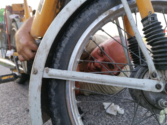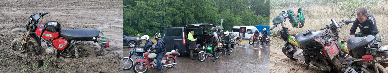 Na, de el jött a reggel, még ha nehezen is. Itt szembesülnünk kellett azzal hogy a pénteki gyönyörű idő teljesen elromlott. Szakadó esőben indultunk útnak a Micskó és Gonda Tiborral (Babetta 207). Erősen belehúztunk, és már a 4. kilóméternél jeletkeztek a műszaki problémák. Rövid vacilálás után (mivel a versenyszellem nállam mindig győz) mondtam is hogy "Tibik! Ti szerelésben mazohisták vagytok!". Az én vallásom pedig nem ez, szóval a fejemben tomboló verseny lovak azt mondatták velem, hogy menj tovább! Tibiéket hátra hagyva, picit unalmasabban, de szépen haladósan teltek a kilóméterek. Beértem a Farkas Gáborék csapatát, nekik a navigációval voltak problémáik. Az én megbízhatatlanul, de működő navimmal egész a 8-as pontig jöttek ők is. Itt elváltam tőlük, ők ebédelni akartak, engem pedig hajtottak a lovak! Innen gyakorlatilag szabadfogású lett a túra. Élveztem végig, a minimál homok, az eső miatti minimál por, a gyönyörű friss eső utáni illatok, amit egy autóban ülve sosem venne észre az ember. Szóval élménymotoroztam. Egyetlen dologra kellett figyelnem csak, hogy le ne álljon a kis vas. Hisz az előző két taknyolásom egyikénél elhajlott pedáltól nem volt egyszerű az újraindítás. Eleinte..., aztán később sok kosz megette a szabadonfutó racsnit, így már végképp nem tudtam se pedálozni, se indítani. Majd a teljesen megszünő hátsófék miatt lettem abszolut kamikáze. Na, de lényeg a lényeg: fantasztikus volt. A homokba és a porban motorozzon, aki jobban szereti mint ezt.