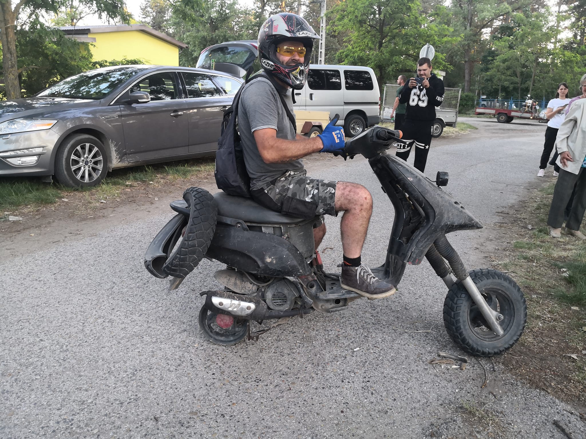 Eljött 18-a Pünkösd előtti szombat. Kicsit korábban keltem, mint szoktam Sárban bevártam Viktor haverom. Ekkor a többi ismerősöm már valahol a start közelében volt ők korábban indultak, mert nem tudták még mi vár rájuk. Én motorral talpon érkeztem nem nagy táv kb. 30 km később fontos lesz ez a infó. Rajt nagyon gördülékenyen ment nem telt bele 5 percbe és már el is hagytuk a kemping területét. Szokásos látvány fogadott az első pár ellenőrző pontig mindenfele elhagyott alkatrészek keresték gazdájukat út szélén szerelő motorosok, benzin kanna tele benzinnel, de már ment vissza a gazdája. Megérkeztünk a gázlóhoz ahhoz a hírhedt gázlóhoz, ami évek óta Mopedrallyisták éjszakáit teszi tönkre, hogy megoldják a motor vízállóságát. Szervezők csak mosolyognak és kedvesek egy kérdés teszek feléjük: „hogy lehet sok pontot szerezni?” Amennyire csak mertem nagygázzal át és legrövidebb fékúttal a nézők testi épségét nem veszélyeztetve megállás és csengő nyomás. Azt hiszem sikerült, de ezt az időt egyelőre csak Takiék tudják! Gázló túloldalán bevártuk az ismerősöket Viktor kitalálta menjünk be hozzá úgy is útba esik, időbe bele fért akkor már egy kis hegesztés nekem átöltözés és tankolás (neki) én csak egy zoknit kértem tőle! (A tankolás fontos lesz)
