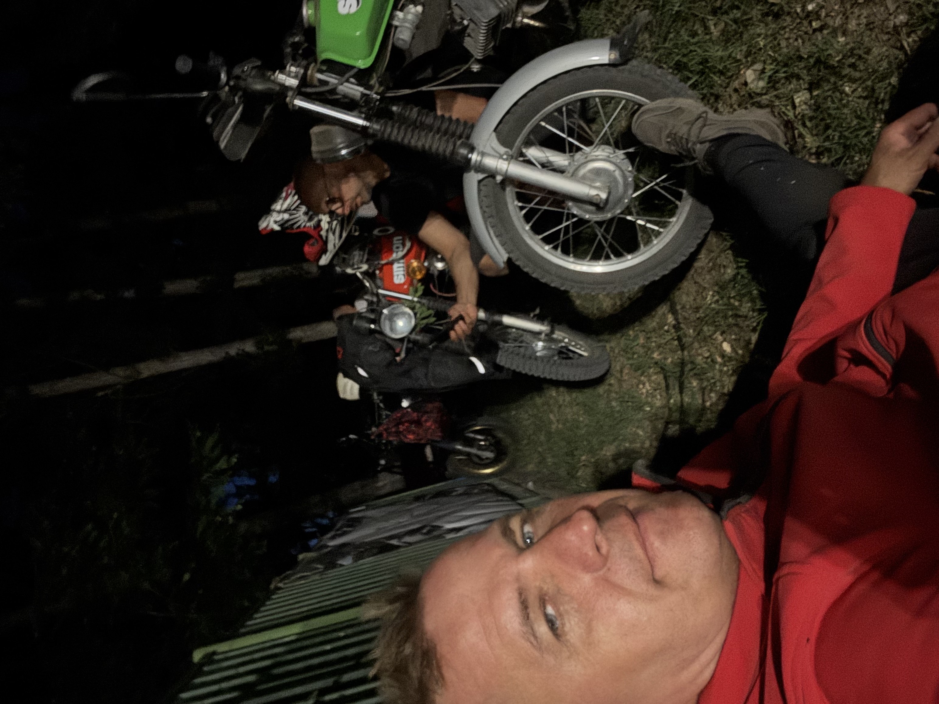 Amikor a csapat valamelyik tagja elgyengült és a feladást fontolgatta, valahogy mindig sikerült túllendíteni magunkat ezen a mentális állapoton és továbbmentünk. Egészen a 17. ellenőrző pontig tartottuk magunkat, na meg utána még egy kicsit…! De a 237 km-nél már brutálisan elfáradtunk, plusz a fiam motorja teljesen feladta a harcot…így ki kellett vontatnom a legközelebbi aszfaltos útra, hogy a kísérő autó felvegye. Ekkor még két bajtársunk is feladta, mert már ránk sötétedett és este 21.00-óra volt…!